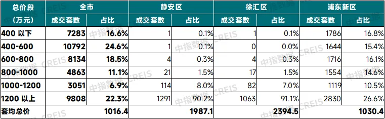 第二,从可供选择的房源来看,根据中指数据,2025年,静安区和徐汇区成交的总价1000万以上房源占比高达98%,1200万以上房源占比超90%,而成交的二手房中,70m²以下套总价低于600万的住房占比超50%,可见两区的新房价格偏高,对于出售二手房置换本区新房的购房者来说,可操作难度或较大;而浦东新区成交的1000万以下房源占比超60%,套总价均值约1030万元,购房者可选择的房源较多。