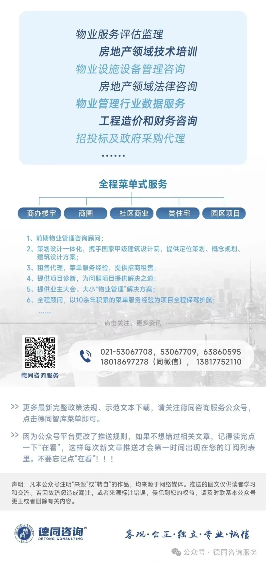 欢迎来电德同咨询各项业务:021-53067708,53067709,13817752110,18018697278(同微信)最新相关政策法规、技术标准规范、示范文本关注本号后即可查阅、下载、运用。