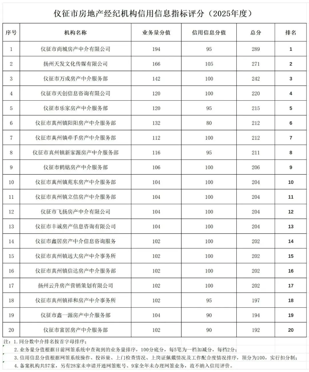 2025年仪征市房产中介信用评价工作已按时完成,市住建局锚定行业诚信建设主线,严格执行信用评价标准,全覆盖核查中介机构资质备案、投诉率、服务质量等关键信息,精准归集、如实评定,做到评价有依据、结果可追溯。