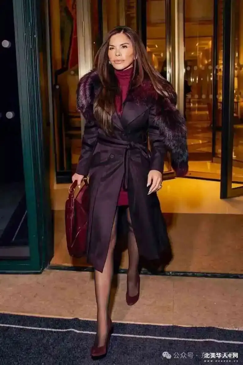 最近巴黎高定时装周,56岁桑切斯穿深紫色大衣和一条毛皮披肩,一眼阔太