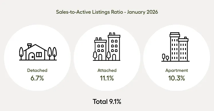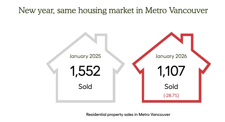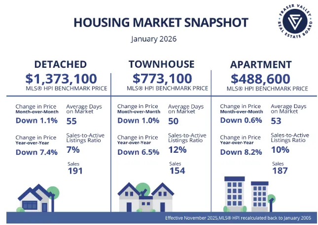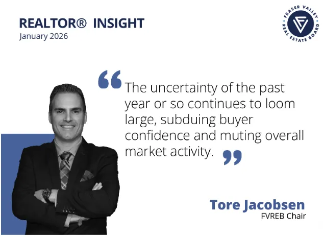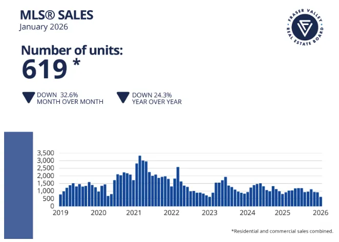 尽管房价持续走软,但仍不足以吸引买家入市。菲沙河谷房地产局(FVREB)数据显示,2026年1月通过 MLS® 系统录得成交 619 套,较12月下降 33%,同时比去年同期低 24%。