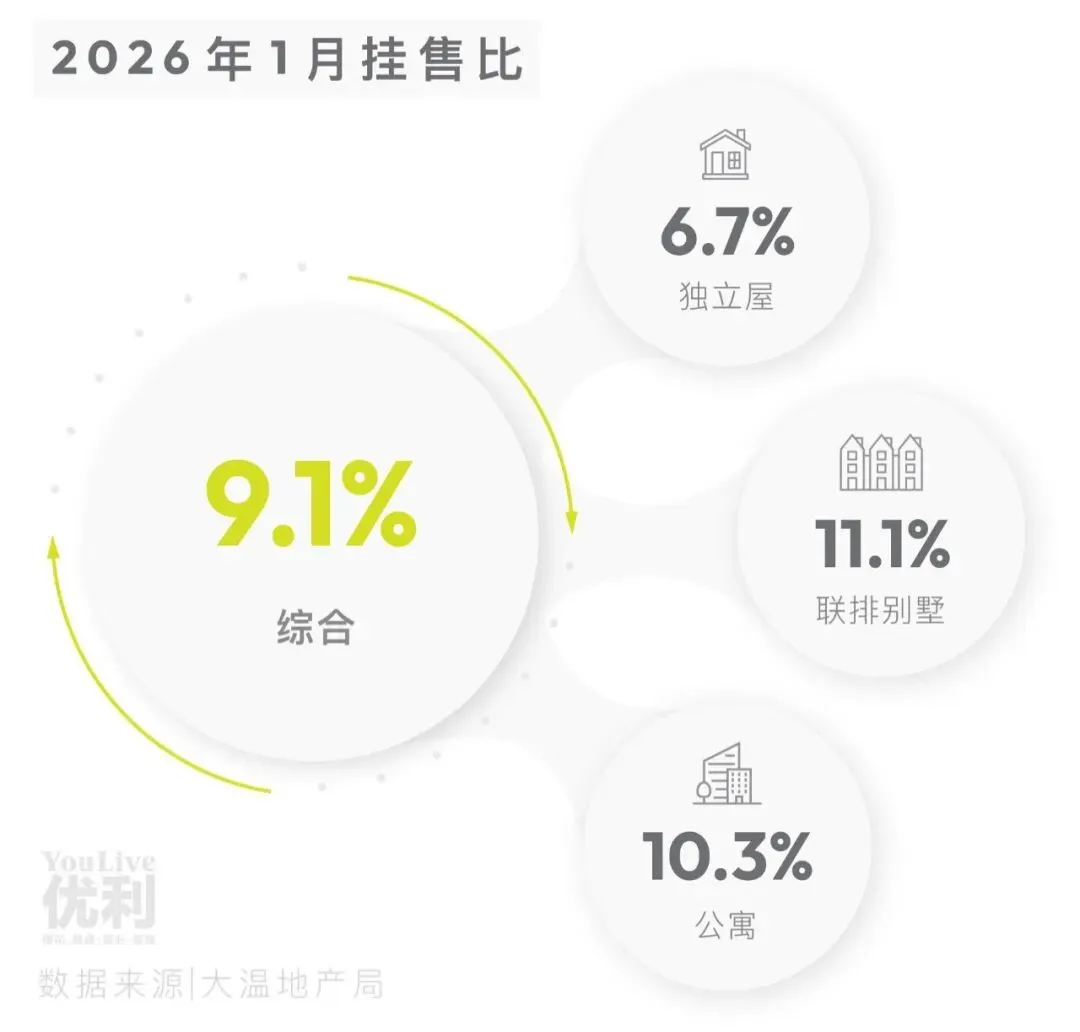 1月新挂牌房屋套数为3,078套,同比2025年1月减少了10.3%,环比2025年12月增加了128%。目前挂牌房屋总数为7,711套。