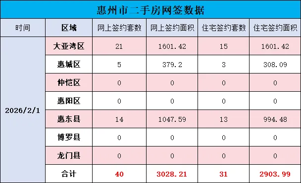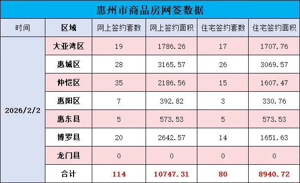 大亚湾区网签19套,面积1786.26㎡;惠城区28套,3165.57㎡;仲恺区35套,2186.56㎡;惠阳区7套,392.82㎡;惠东县5套,573.53㎡;博罗县20套,2642.57㎡;龙门县0套,0㎡。合计114套,10747.31㎡。