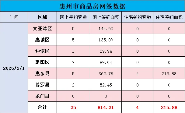大亚湾区网签5套,面积144.93㎡;惠城区5套,135.09㎡;仲恺区1套,29.94㎡;惠阳区7套,89.04㎡;惠东县5套,362.76㎡;博罗县2套,52.45㎡;龙门县0套,0㎡。合计25套,814.21㎡。