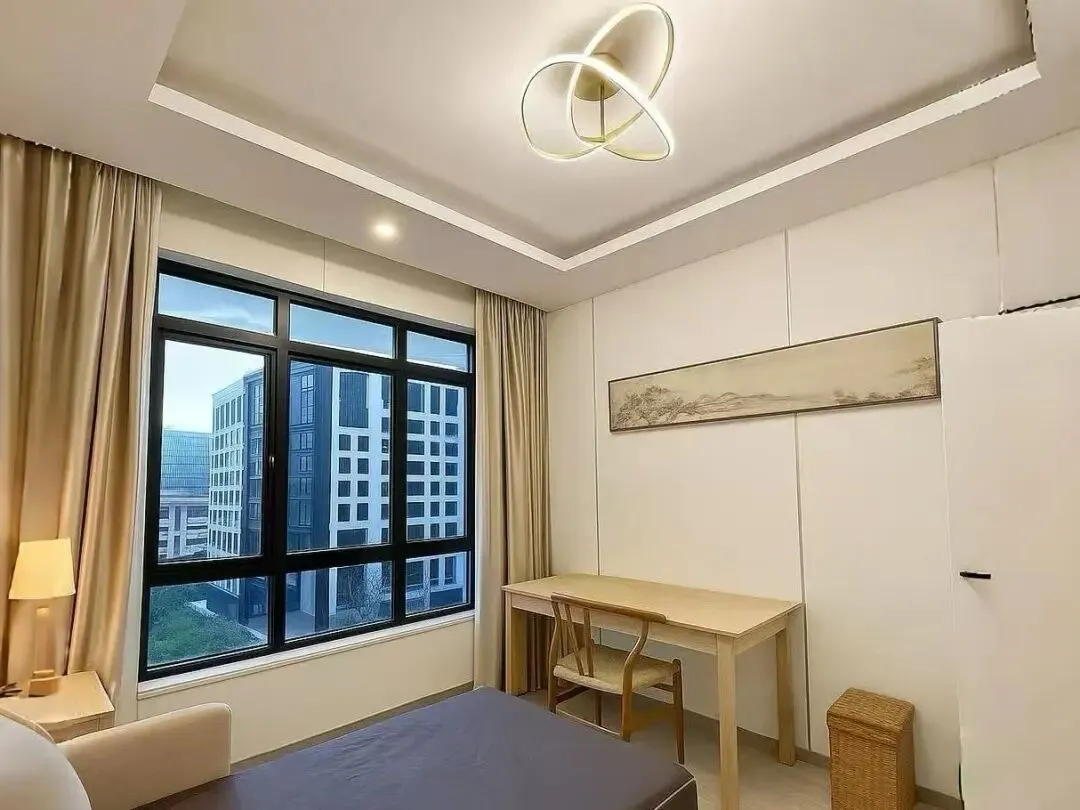 房间带大窗户,望出去是绿景,采光好不压抑。