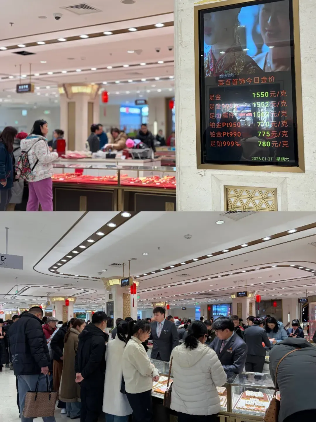 据搜狐财经在1月31日实探,当天菜百一楼购买金饰的顾客络绎不绝,有人起大早排队入场,三楼卖金的队伍更是蜿蜒数百人,需要等待两小时才能排到号。