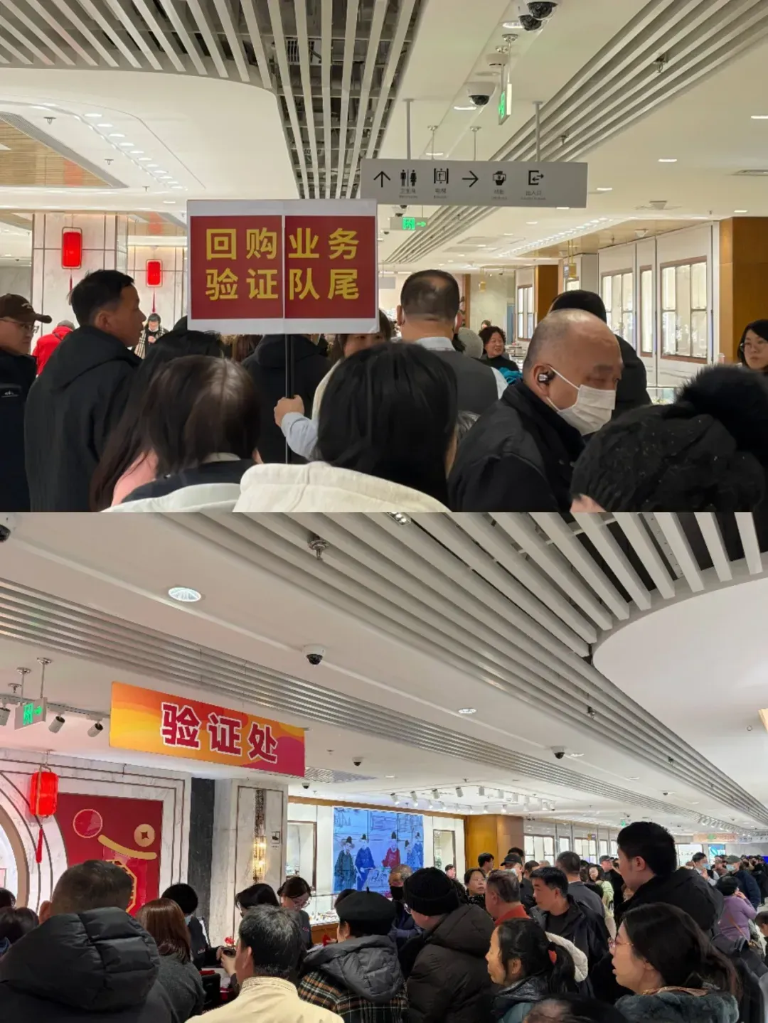 卖金的队伍在三楼蜿蜒成一条长龙,等候时间长达两小时,一位手持200克金条、准备“卖一半”的北京大爷坦言:“也就这两天,之前没那么多人。”