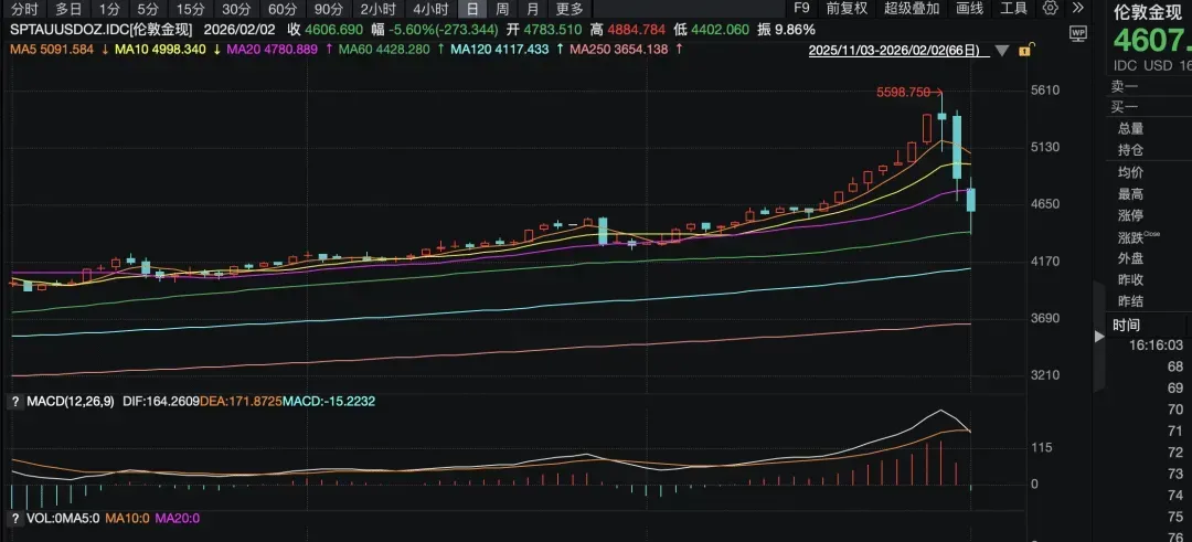 1月30日,黄金单日暴跌9.25%,跌破5000美元心理关口;至2月2日,价格一度下探至4500美元附近,较高点回落接近20%。