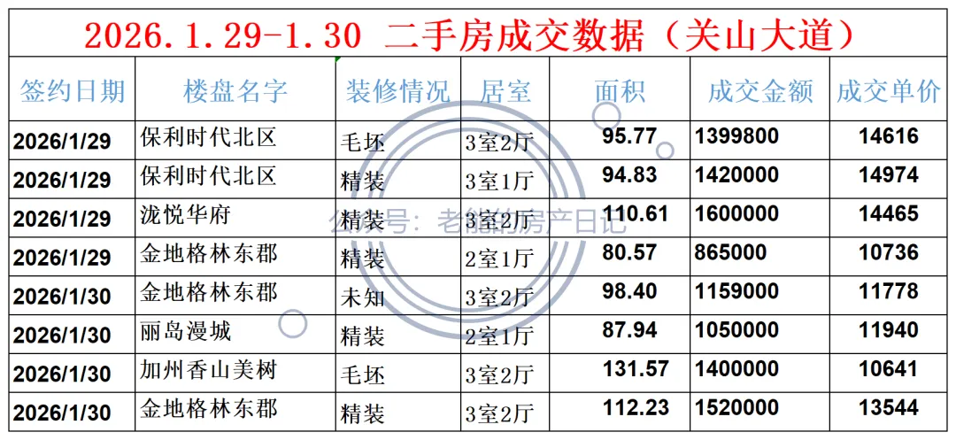2026.1.29-1.30 二手房成交数据 (关山大道)