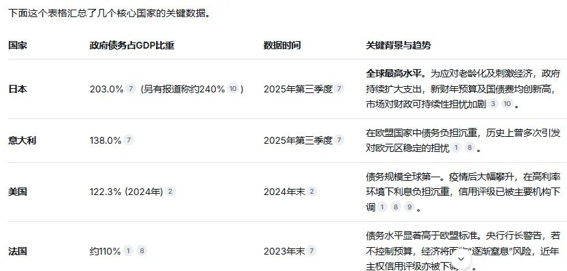 全球主要发达国家,债务比率(政府债务/GDP)基本都在100%以上: