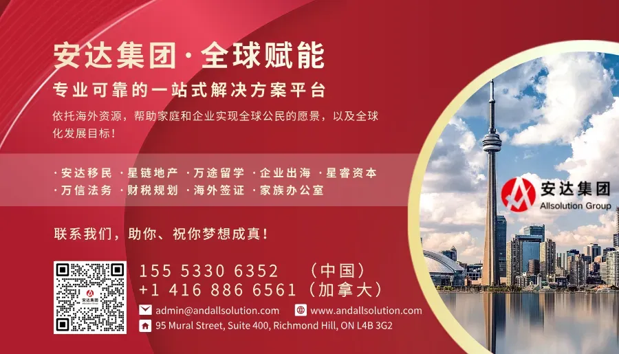 ---------------------------------------------------------------------------------------------------------------------实现全球移民、留学、投资梦想,从安达集团开始!我们为您提供一站式定制服务,无论是移民规划、留学申请,还是海外投资,我们的专业团队都将为您量身打造最佳方案!依托多年行业经验和强大的全球资源,我们将复杂流程变得简单,助您快速踏上成功之路。