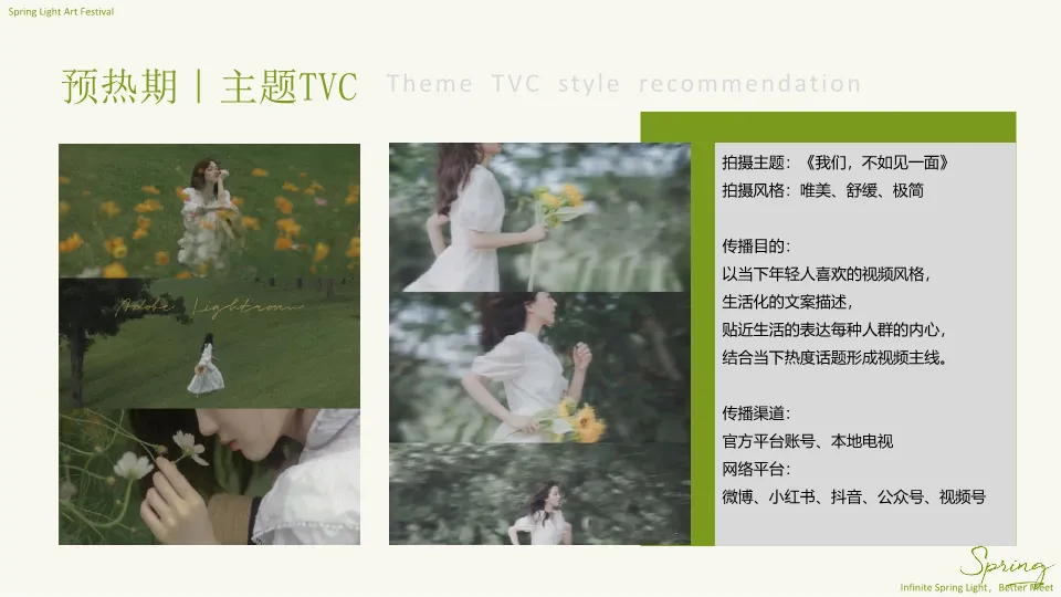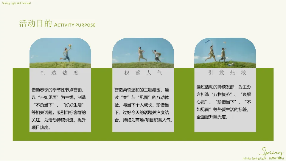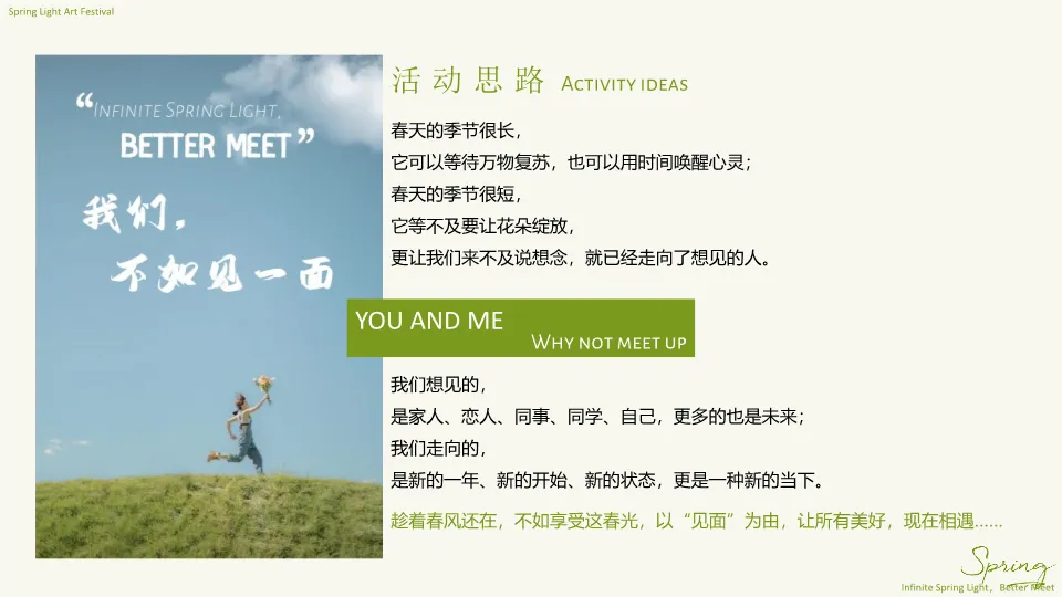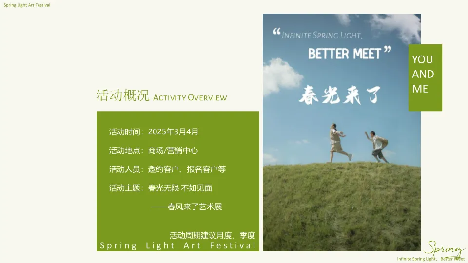 本方案为2026年商业地产春季营销活动——“春光无限·不如见面”露营艺术节的完整策划案。活动旨在借助春季节点,以“见面”为情感主线,通过露营与艺术结合的形式,为商场或营销中心制造话题热度、积蓄人气。方案系统规划了活动概述、前期宣传、活动规划与细节四大板块,详细阐述了从主视觉设计、分阶段宣传(预热、爆发、续热期)到现场艺术展览、氛围布置及日夜活动流程的完整执行路径,是一份结构清晰、创意新颖、可操作性强的整合营销策划范本。