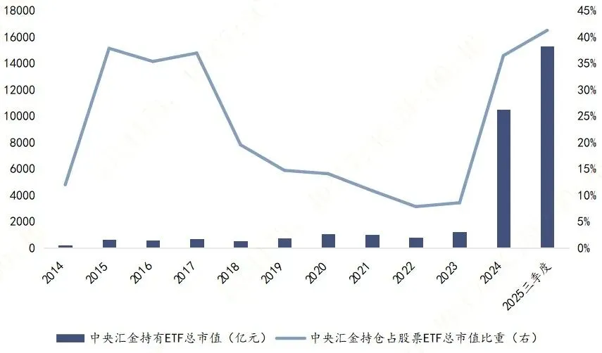 类似的操作,我们可以看一下大A,中央汇金是怎么做的,在2024年924之前,大A跌到谷底,中央汇金开始在3000点之下大举买入,持仓市值从1247亿暴增近8倍至1.05万亿,而其持仓占比则从8.59%跃升至2025年中的36.47%。