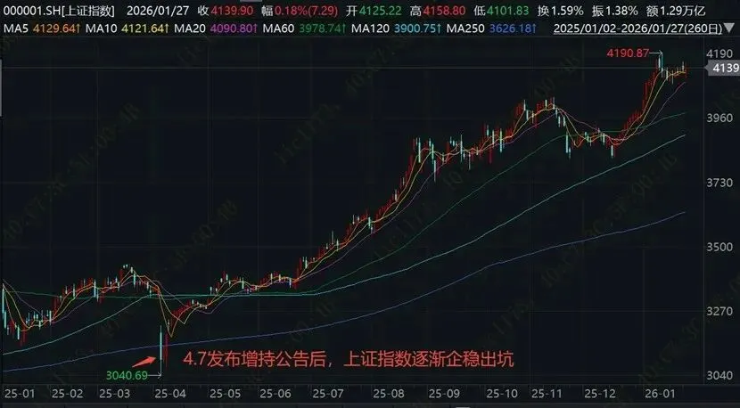 在2025年4月7日,当懂王宣布向全球打贸易战,大A被砸出一个大坑,中央汇金紧急发布公告,表示稳市场,增持。