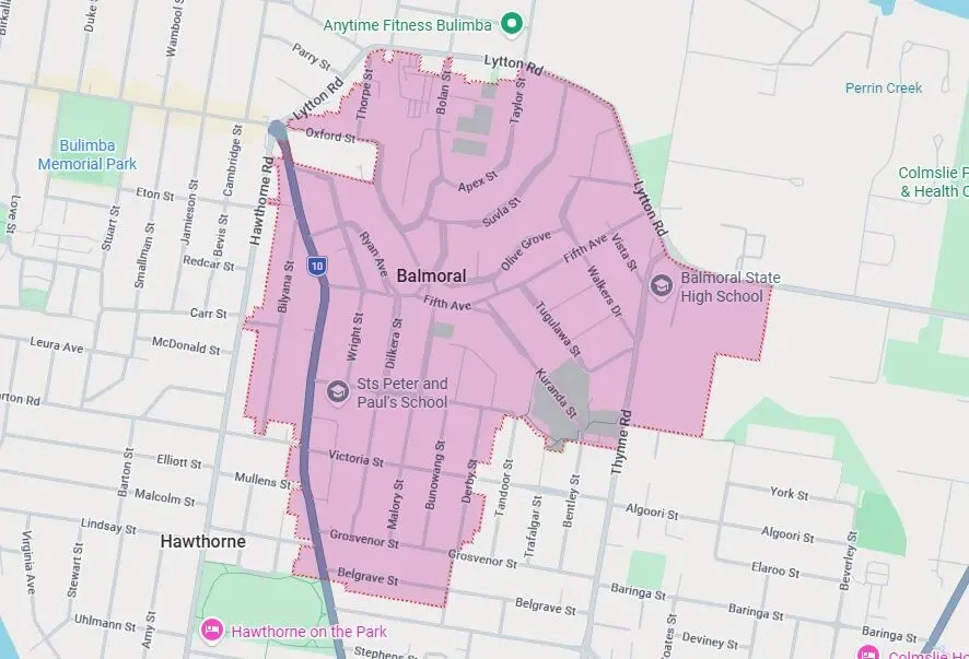 Balmoral 位于布里斯班市东部内城区,距离市中心仅约 5–9 公里,紧邻布里斯班河畔。东邻 Morningside,西接 Bulimba,周边交通便利,既可快速到达 CBD,也能享受河畔的宁静生活。该区面积不大,但因靠近 Bulimba 的商业街区和休闲设施,生活便利性极高。