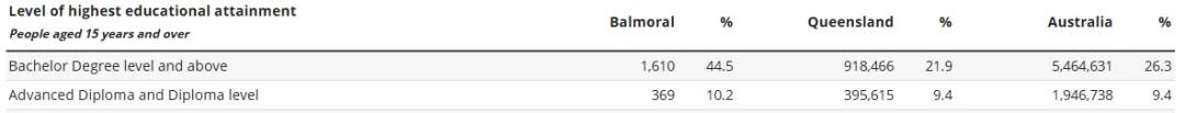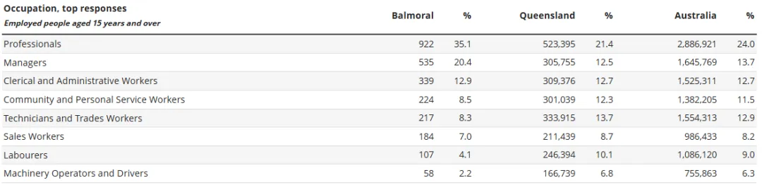 在教育方面,约44.5%的居民拥有学士或更高学位,高于昆士兰州平均水平21.9%,显示该区受教育程度整体较高。在就业方面,参与劳动力的人占比75.4%,职业结构以专业人士和管理人员为主,共占比55.5%,反映了该区偏向知识型、管理型岗位的居民构成。