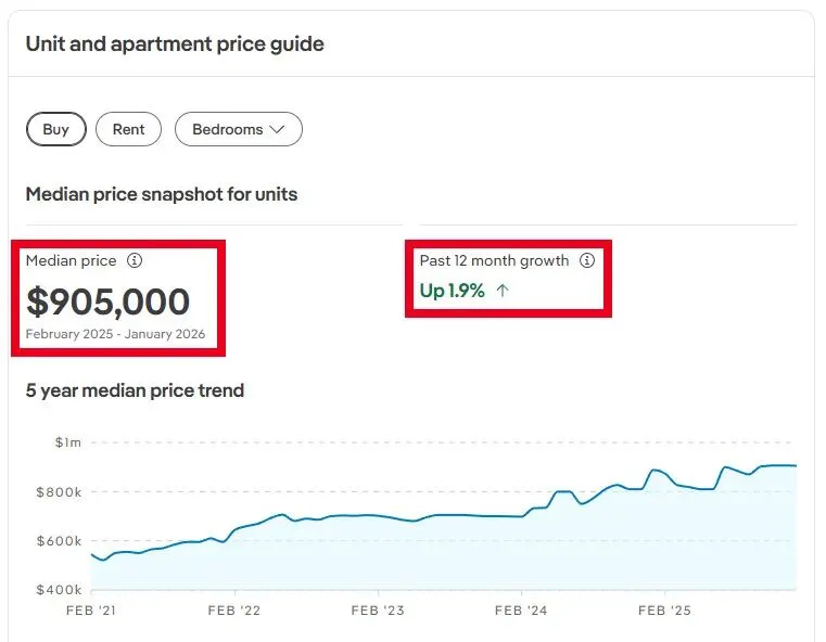 Balmoral区域的公寓的中位价为197.2万澳元,近12个月上涨了3.8%;租金中位价为945澳元/周,近12个月上涨了5.0%。