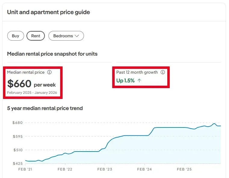 该区的公寓的中位价为90.5万澳元,近12个月上涨了1.9%;租金中位价为660澳/周,近12个月上涨了1.5%。