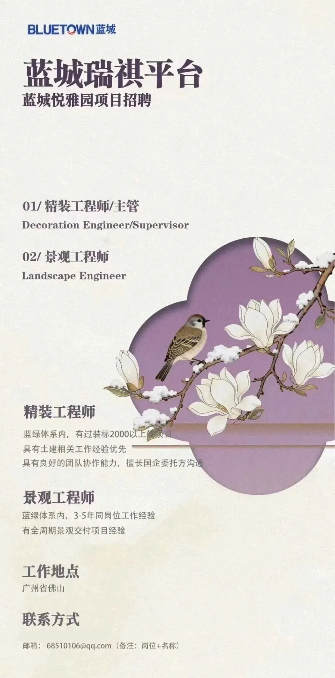 2、工作经验:25-40岁,5年以上房地产项目景观工程施工管理或设计管理经验,独立负责过住宅小区、商业综合体或市政景观类项目者优先;熟悉房地产建设程序、景观施工流程及竣工验收规范;