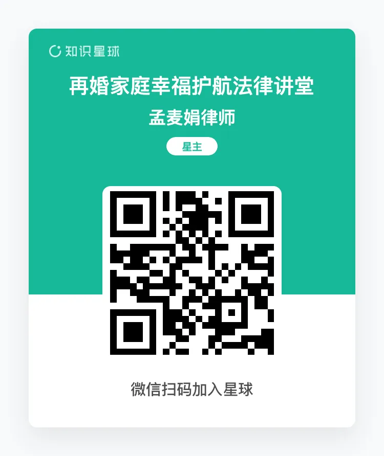 再婚不是第二次初婚,其挑战具有叠加性。为此,孟律师建了知识星球‘再婚家庭幸福护航法律讲堂’,核心解决再婚群体‘怕踩坑,想安心’的需求,欢迎大家加入。