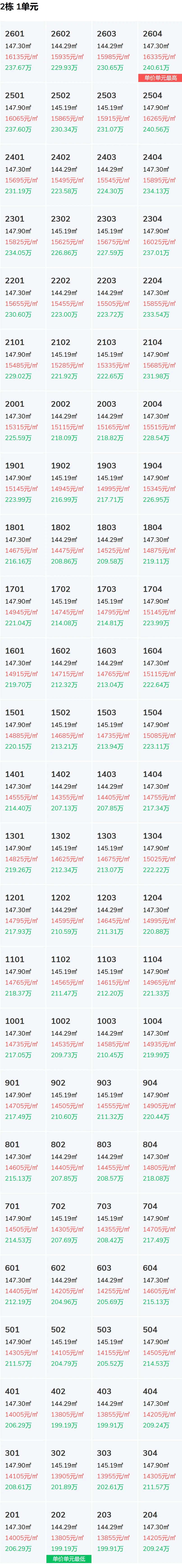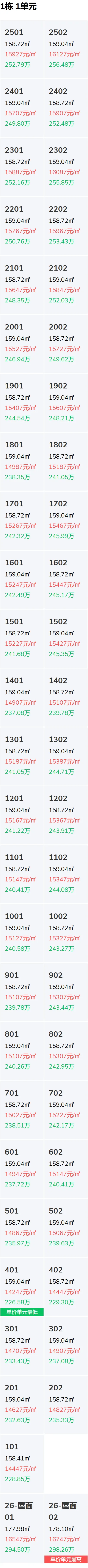 1栋,总26层,房源量51套,备案均价15341元 /㎡,备案总价区间227-298万。