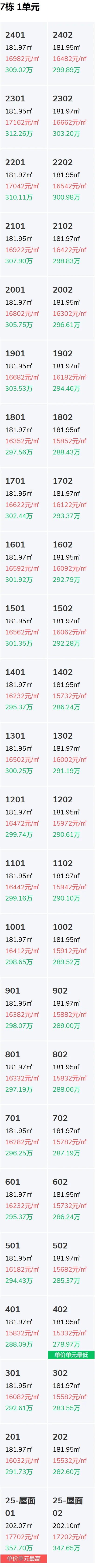 7栋,总25层,房源量48套,备案均价16290元 /㎡,备案总价区间279-358万。