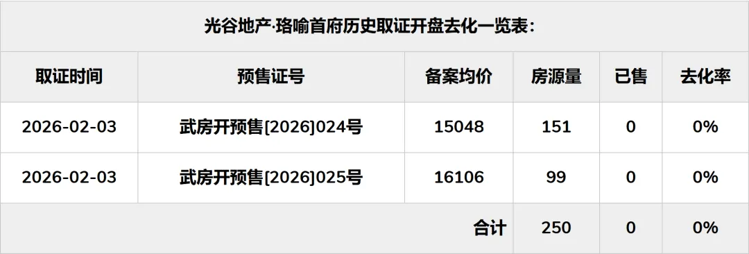 截至目前,光谷地产·珞喻首府累计取证开盘2次,首次开盘2026年02月03日,距今。累计供应房源250套,累计已售0套,总去化率0%。明细如下: