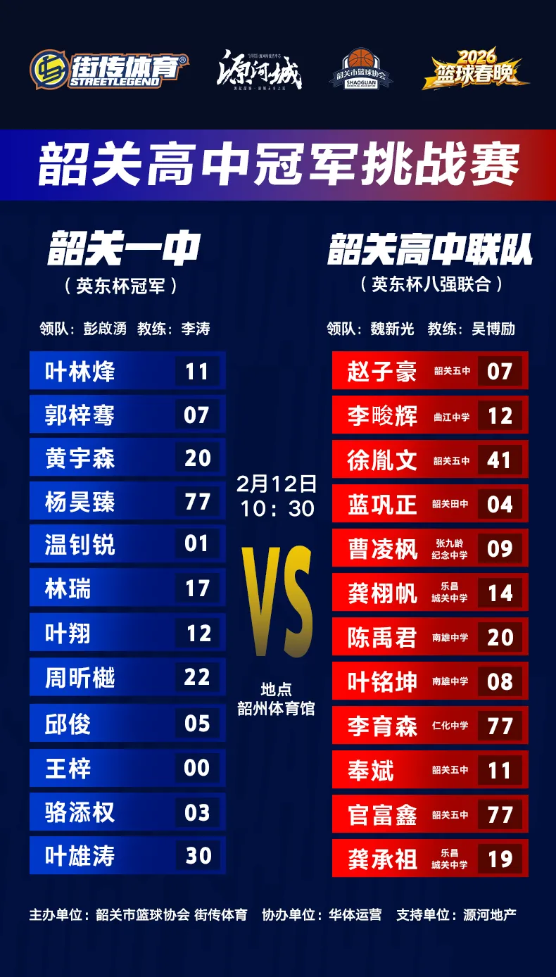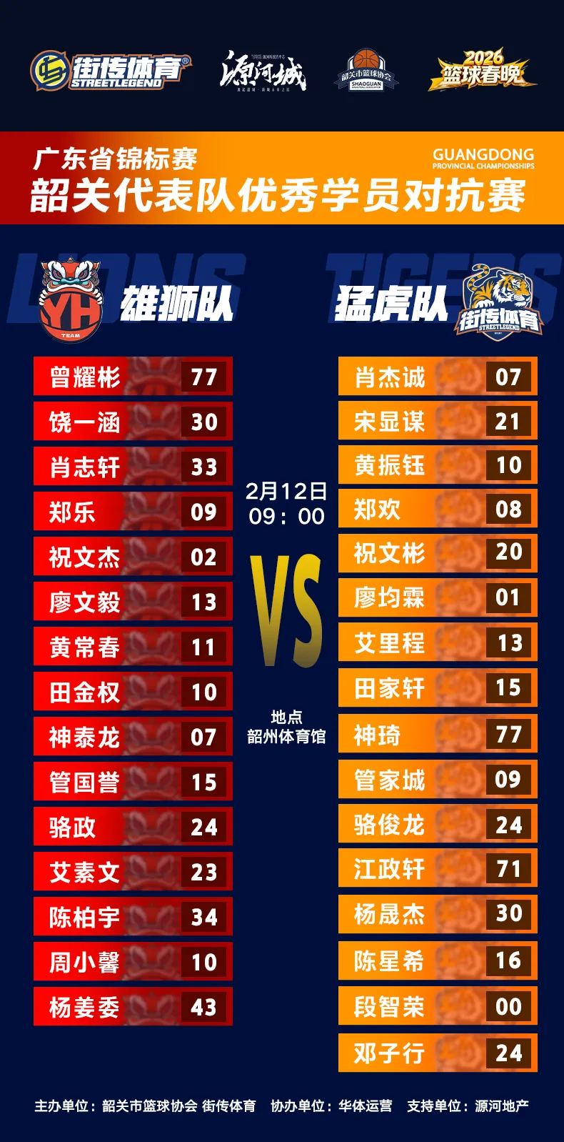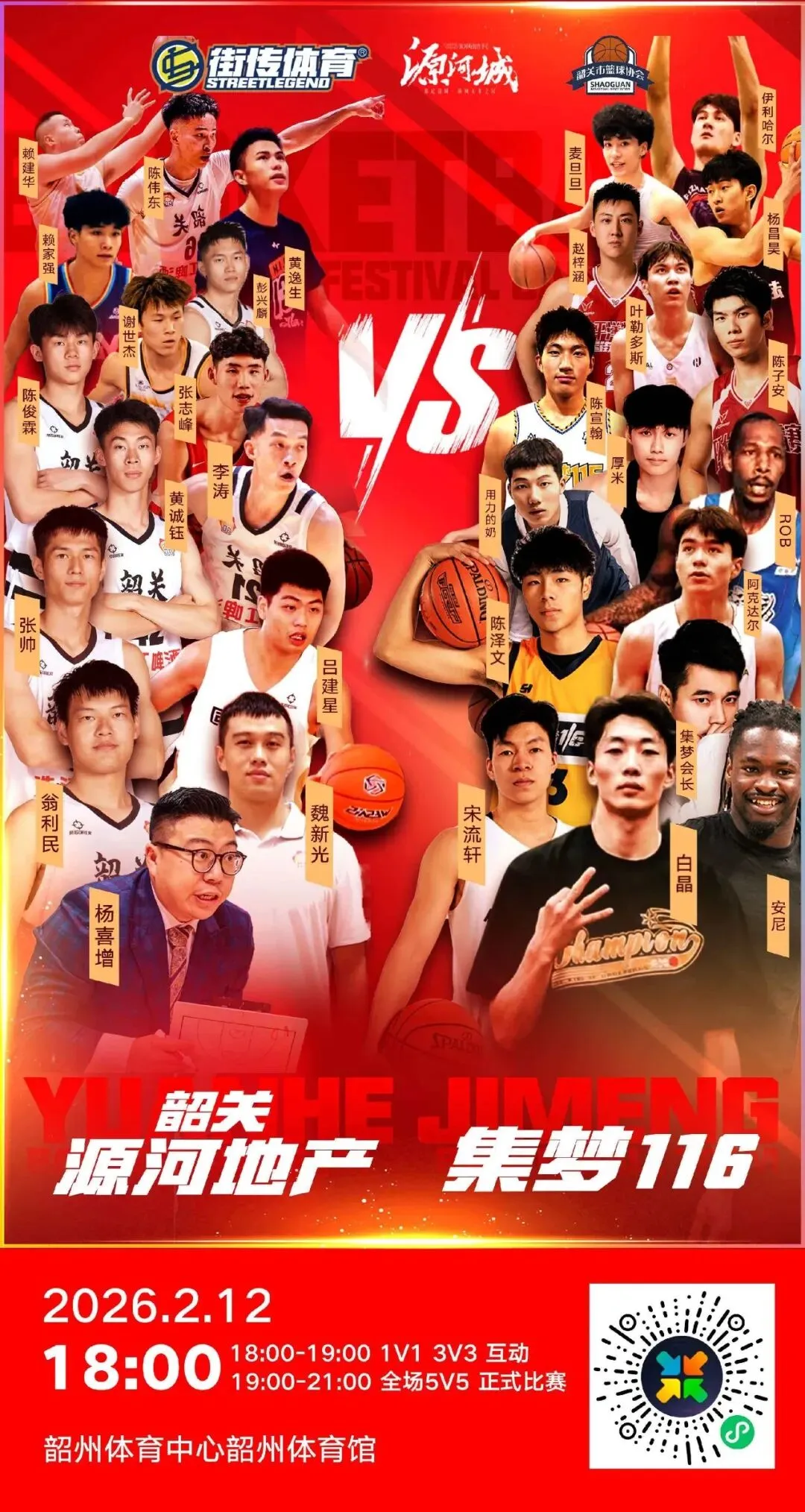 篮球燃动贺新春,韶城聚力向未来!由韶关市篮球协会携手韶关市街传体育文化传播有限公司、源河地产联合主办的2026篮球春晚,即将在2月12日(周四)精彩启幕。这场融合篮球竞技、新春喜乐与本土特色的篮球文化大餐,将以热血运动之姿,为韶关市民奉上一份别样的新春祝福!让大家在辞旧迎新的氛围中感受丰富多彩的篮球盛宴。