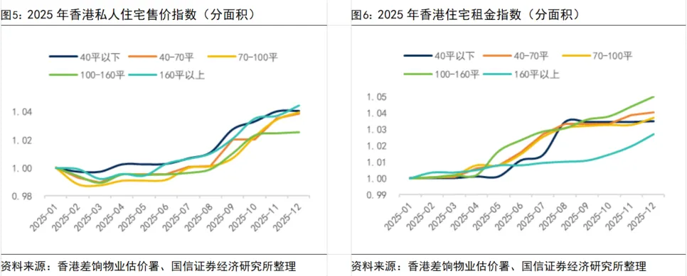 2025年香港私人住宅成交量+21%,为2013年以来的第二高水平,连续两年规模上涨;价格指数自3月确认底部后连续三个季度企稳回升,较底部回升4.8%,全年+3.3%;租金指数全年+4.3%,已超过2019年达到历史新高。本轮复苏呈典型的“量在价先”,成交量处于历史高分位,价格较2021年9月的历史高点仍有大约25%的回撤,目前大约在2016年三季度的位置水平。