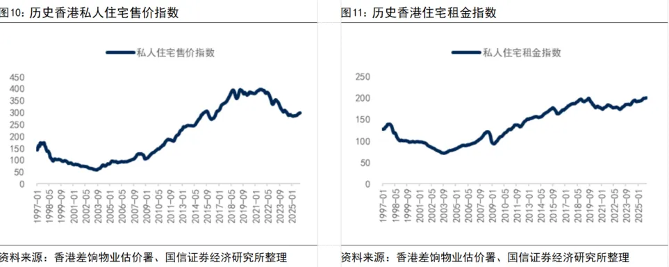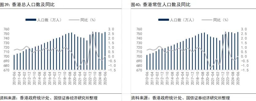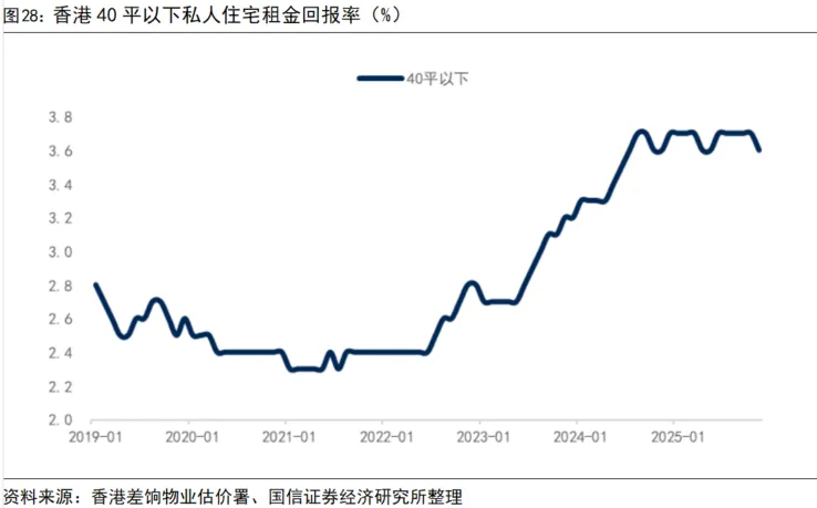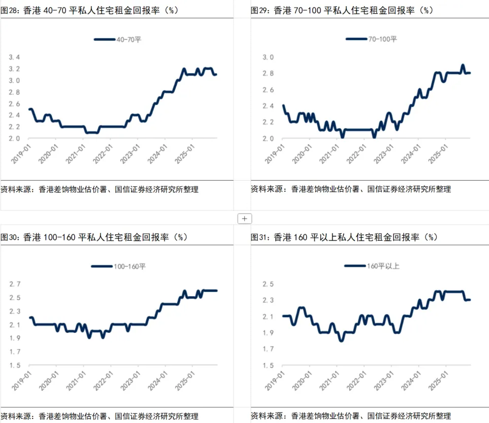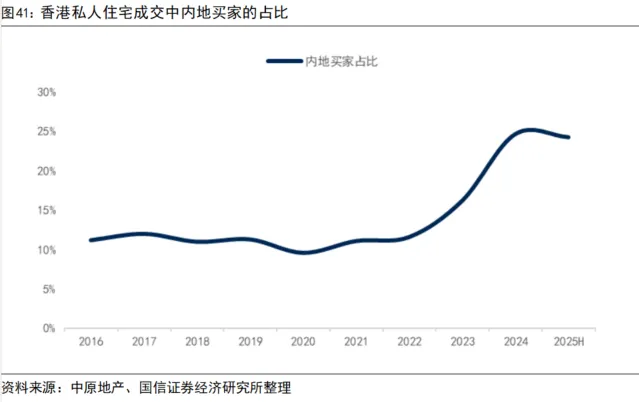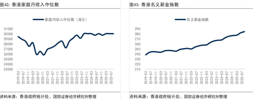 人口流入和收入提升带来需求托底:截至2025上半年香港常住人口增速已环比转正,人才计划有效逆转了三年净流出趋势,2024年和2025上半年香港私人住宅成交中,内地买家购买占比分别为25%、24%,远远高于2021-2023年的占比。自2023年末,香港家庭月收入中位数保持在3万港元左右,较2021-2022年提升约10%,收入提升也带来了需求托底的保障。