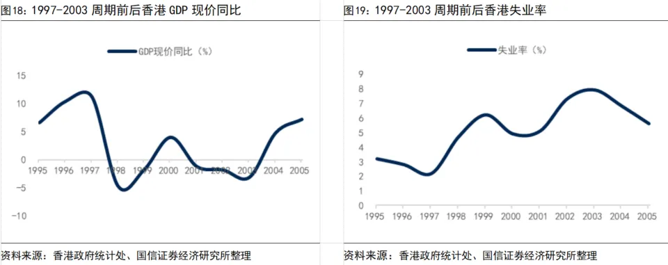 比较1997-2003和2021-2025两轮下跌周期,前者属于“资产泡沫破裂+本地金融危机”,为极端信用收缩情形,后者属于对“估值回调+宏观利率变化”的反应。由于下跌原因的不同,两者回撤时间、跌幅、冲击力等方面均有差异,前者回撤周期69个月,跌幅达66%,后者回撤周期42个月,跌幅达28%。
