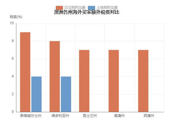 下面这张图表展示了澳洲主要州对海外买家的额外税费负担对比: