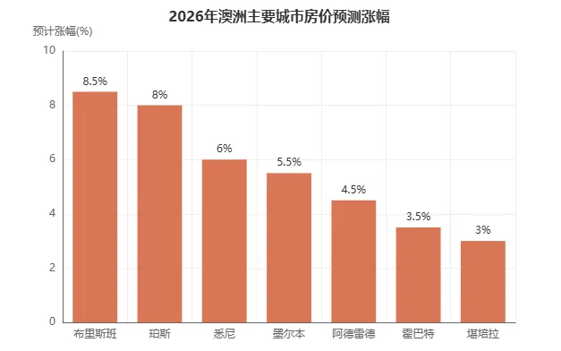 但不同城市的差异很大。布里斯班和珀斯在2026年预计涨幅可达7%-10%。悉尼和墨尔本预计上涨5%-7%。