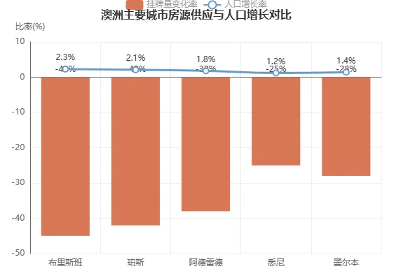 下面这张图表展示了澳洲主要城市房源挂牌量变化与人口增长率的对比: