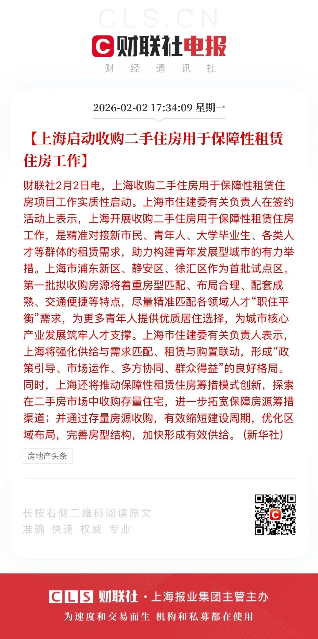 就在2月2日,上海启动收购二手住房用于保障性租赁住房工作。相关负责人表示,上海开展收购二手住房用于保障性租赁住房工作,是精准对接新市民、青年人、大学毕业生、各类人才等群体的租赁需求。上海市浦东新区、静安区、徐汇区作为首批试点区。