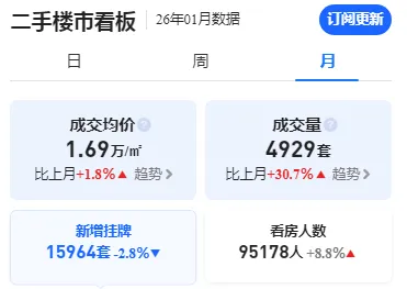 与此同时,据冰山数据,2026年1月,全国26城的二手房挂牌量总体环比下降1.9%,挂牌房源减少超5.6万套。