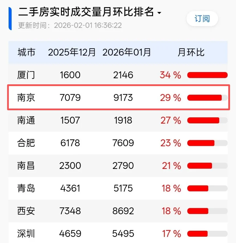 楼市日历数据显示,南京二手房1月实时成交量高达9173套,环比增长29%,排名全国第二,超过北京、上海、深圳等一线核心城市,仅次于厦门。