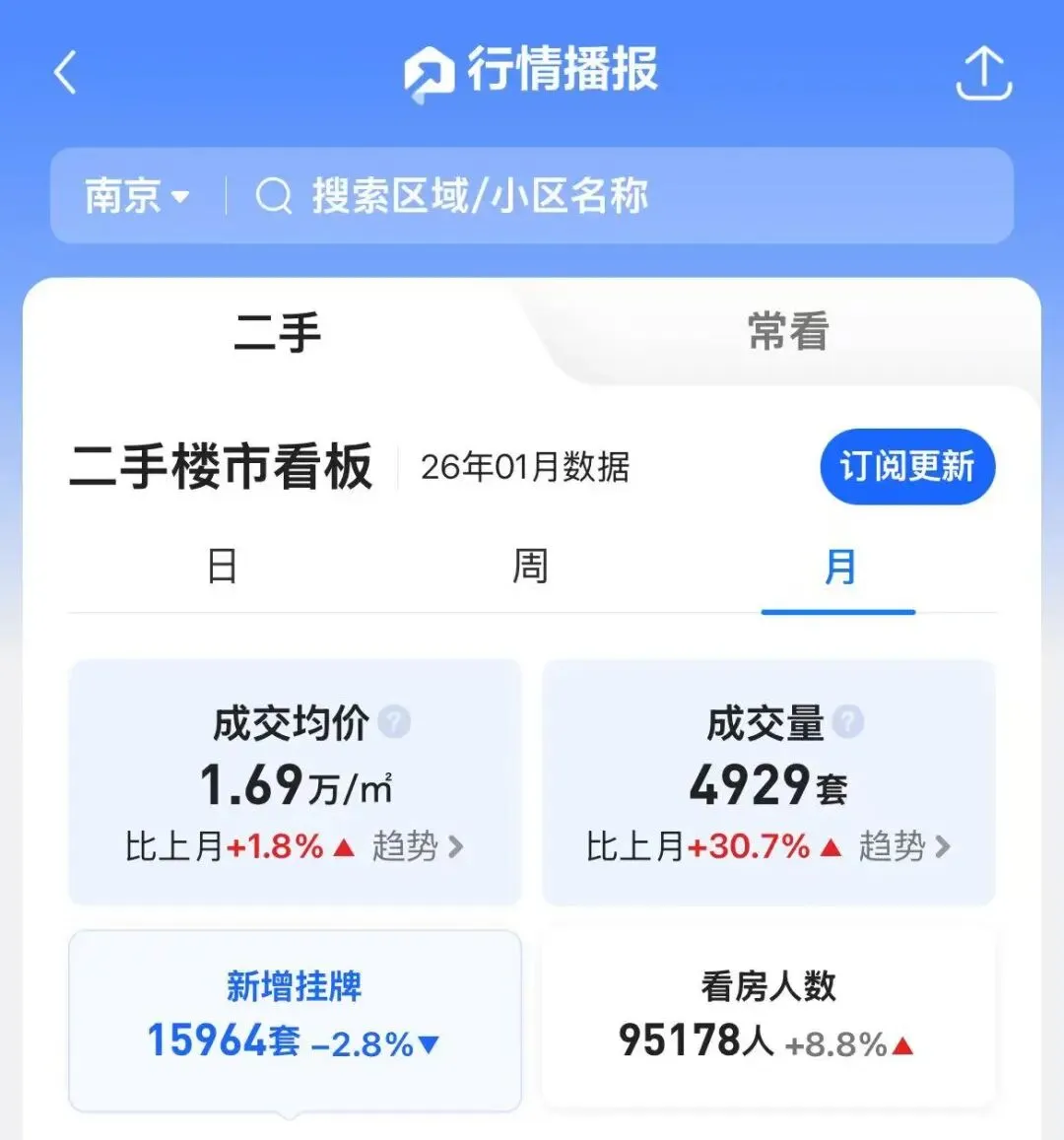 1月南京二手房成交均价1.69万 /㎡,环比上涨1.8%;成交量达4929套(仅贝壳平台),环比大幅上涨30.7%。同期看房人数95178人,环比上涨8.8%,置业需求持续释放。从成交价格来看,河西、南部新城品质次新房、城中学区房开始回涨,城东改善房、江北部分楼盘议价空间收窄趋势明显。
