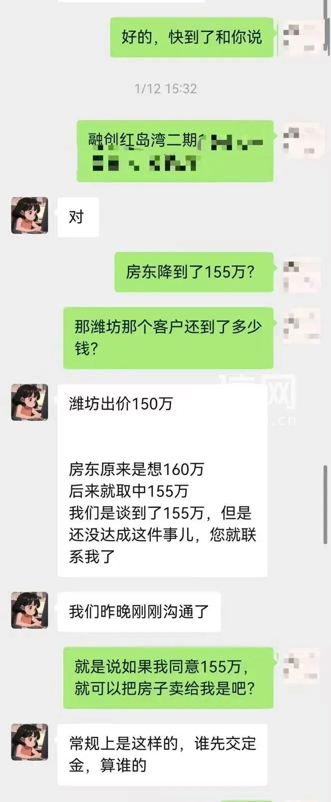 1月12日下午,李先生接到朋友薛先生的电话,询问他是否购买了融创红岛湾二期的房子。原来,薛先生当天在安居客上看到同一套房源信息,发布者正是“有一家”中介那位谢姓经纪人。薛先生看过房子后对房源很满意,与谢姓经纪人进入议价环节。因该经纪人不断催促支付意向金,薛先生心生疑虑并托人查询,才发现该房已在贝壳系统签约。