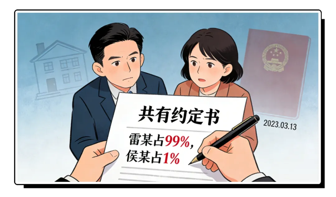 2023年3月13日,侯某、雷某共同签署《共有约定书》,约定案涉房屋登记在权利人雷某、侯某名下,现经全部共有人协商一致,对共有类型为按份共有,雷某占99%,侯某占1%。