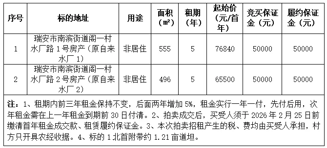 受委托,定于2026年2月11日上午10:00,在瑞安市安福路30号瑞安市农村产权服务中心一楼拍卖大厅,将对以下标的物进行公开拍卖,现公告如下: