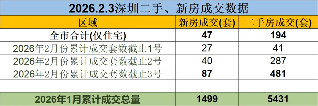 2026年2月3号深圳二手房、新房成交数据