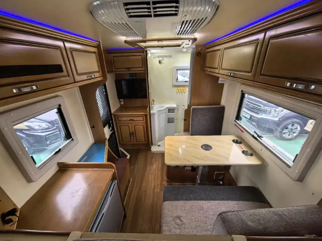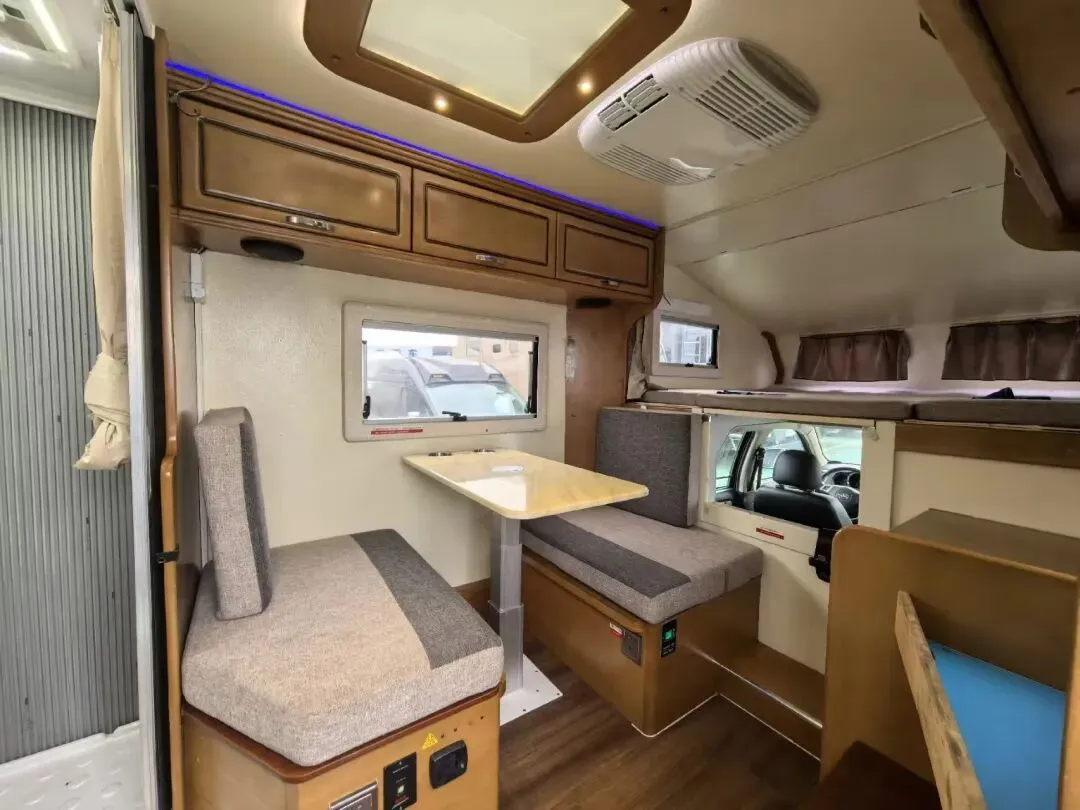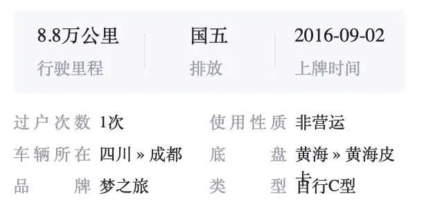 【车辆名称】:梦之旅牛二四驱皮卡房车【上牌时间】:2016年9月【公里数】:8.8万公里【过户情况】:过户次数一次,非营运【底盘名称】:黄海皮卡【动力】:2.4L汽油发动机【驱动方式】:前置四驱【变速箱】:6速手动挡变速箱【排放标准】:国五排放【核载人数】:5人【车身尺寸】:长:5995 宽: 2068高:3020【水电配置】:800Ah锂电池,3000W逆变器,600W太阳能,约110L清水箱,40L灰水箱【电器配置】:宏都顶置空调,燃油加热暖风热水一体机,房车专用冰箱,电磁炉,康佳电视,双向换气扇【卫生间配置】:独立卫生间,淋浴花洒,洗漱盆【户外配置】:手动踏步,户外遮阳棚,防蚊纱帘【其它配置】:倒车影像,高低速四驱,越野轮胎,铝合金轮毂。