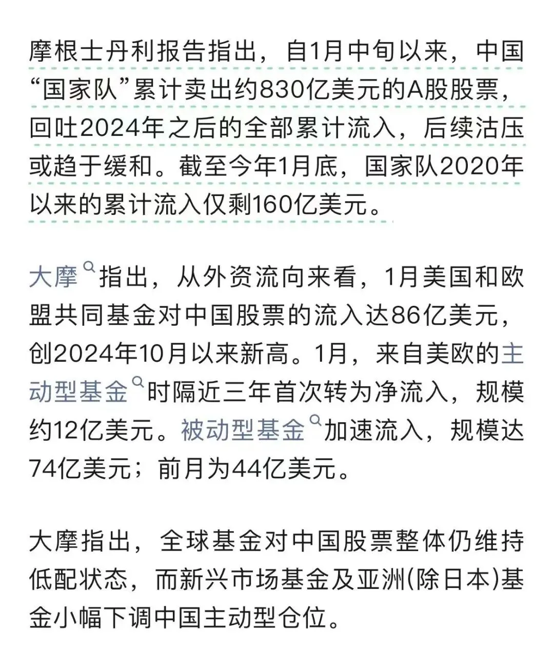 1 .大摩:1月中旬以来国家队累计卖出830亿美元A股,回吐2024年后全部流入。