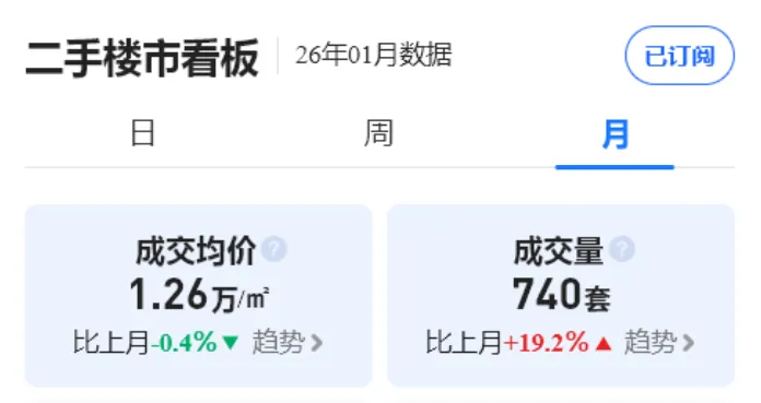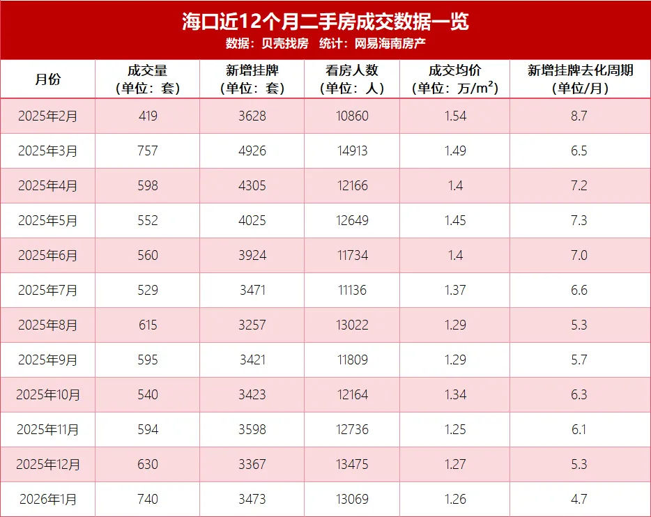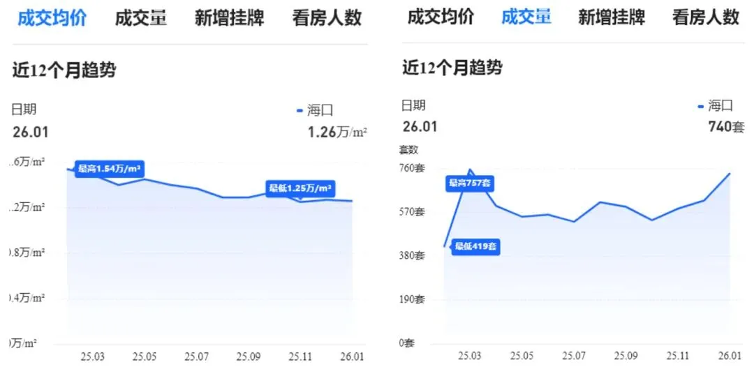 根据贝壳找房数据显示,1月海口二手房成交均价1.26万元/㎡,环比微跌0.4%,价格整体在低位盘整。然而,市场的另一面却异常活跃:1月成交量达到740套,环比大幅增长19.2%。