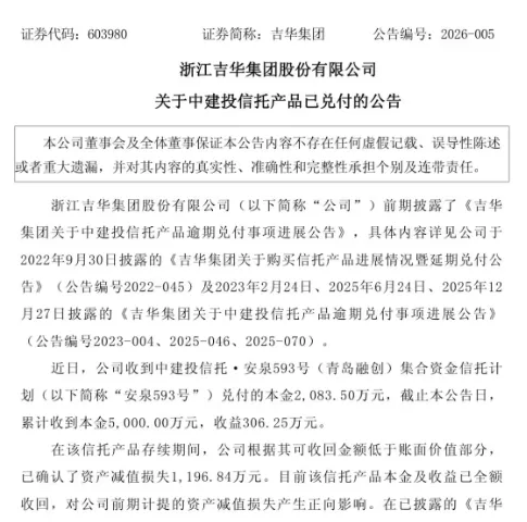 从兑付进展来看,吉华集团称,已累计收到该信托计划本金5000万元及收益306.25万元,实现全额收回。值得注意的是,吉华集团在信托存续期间,曾针对该产品可收回金额低于账面价值部分确认资产减值损失1196.84万元,此次全额兑付将对前期计提的减值损失产生正向影响,也印证了风险处置的实际成效。