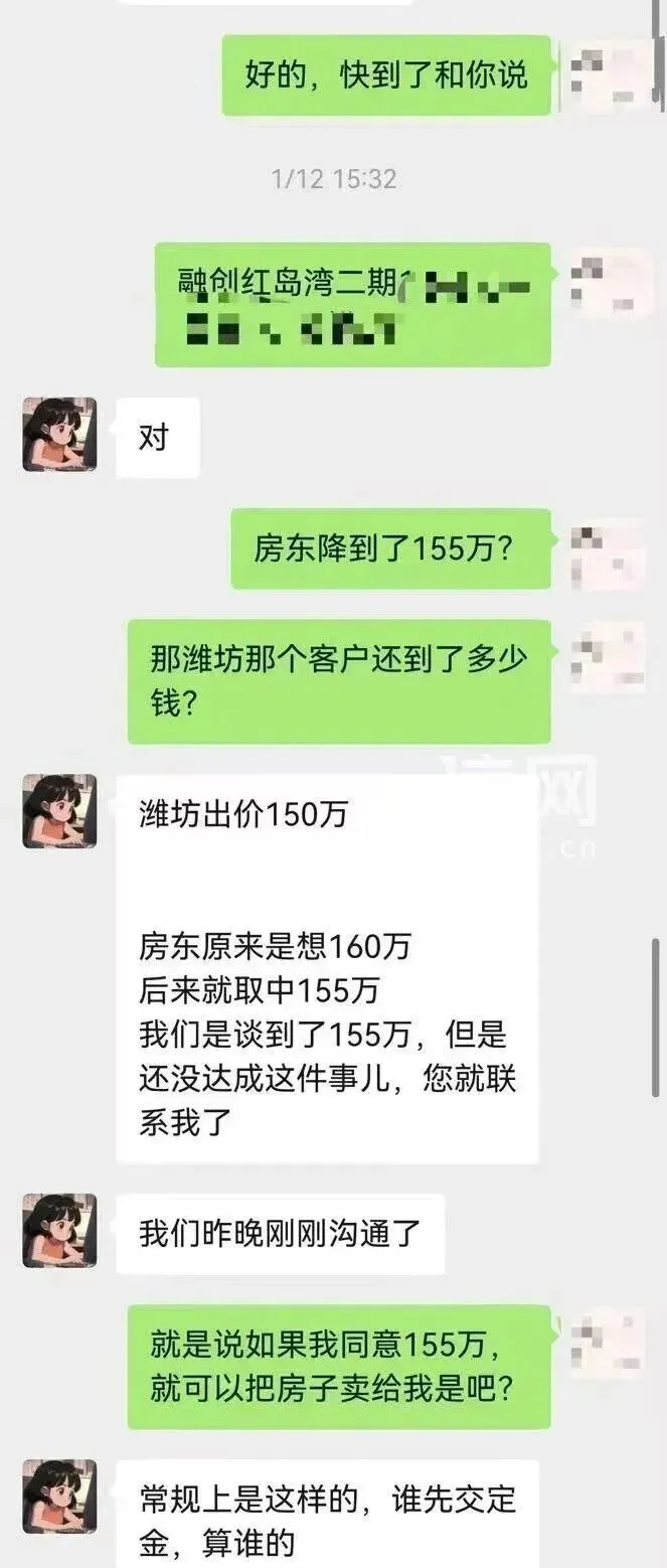 1月12日下午,李先生接到朋友薛先生的电话,询问他是否购买了融创红岛湾二期的房子。原来,薛先生当天在安居客上看到同一套房源信息,发布者正是“有一家”中介那位谢姓经纪人。薛先生看过房子后对房源很满意,与谢姓经纪人进入议价环节。因该经纪人不断催促支付意向金,薛先生心生疑虑并托人查询,才发现该房已在贝壳系统签约。