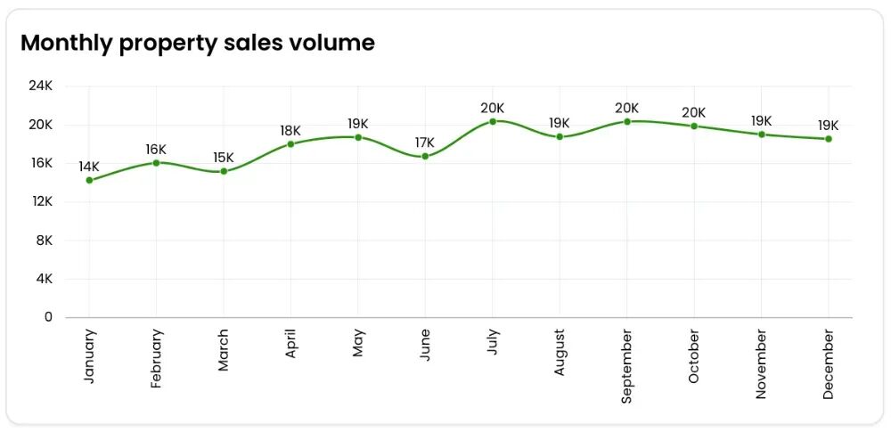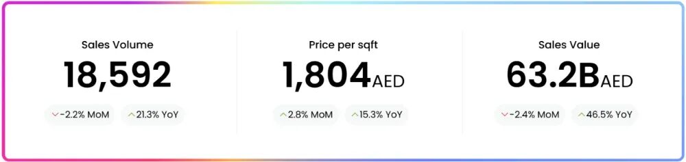 2025年12月迪拜房产交易活动依然遍及经济适用型和高端社区,其中面积较大的住宅表现突出,表明消费者倾向于宽敞的家庭居住空间和长期持有。总体而言,12月是成交量最高的月份之一,为2026年奠定了坚实的基础。通过12月市场表现来看,总交易18592套,同比去年涨幅21.3%;每平方英尺平均单价1804迪拉姆,同比去年涨幅15.3%;总计成交量632亿迪拉姆,同比去年涨幅高达46.5%;整个市场步入良性发展周期。1·期房引领市场,占总销售额70%以上2·超1000万迪拉姆的房产交易量强劲增长