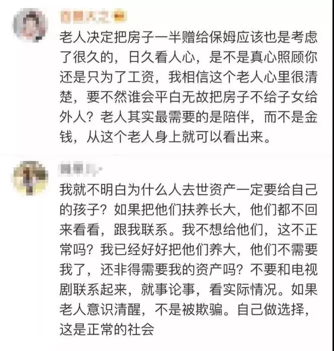 但对于老人立遗嘱将房产赠保姆一事,网友却有着不同的声音。