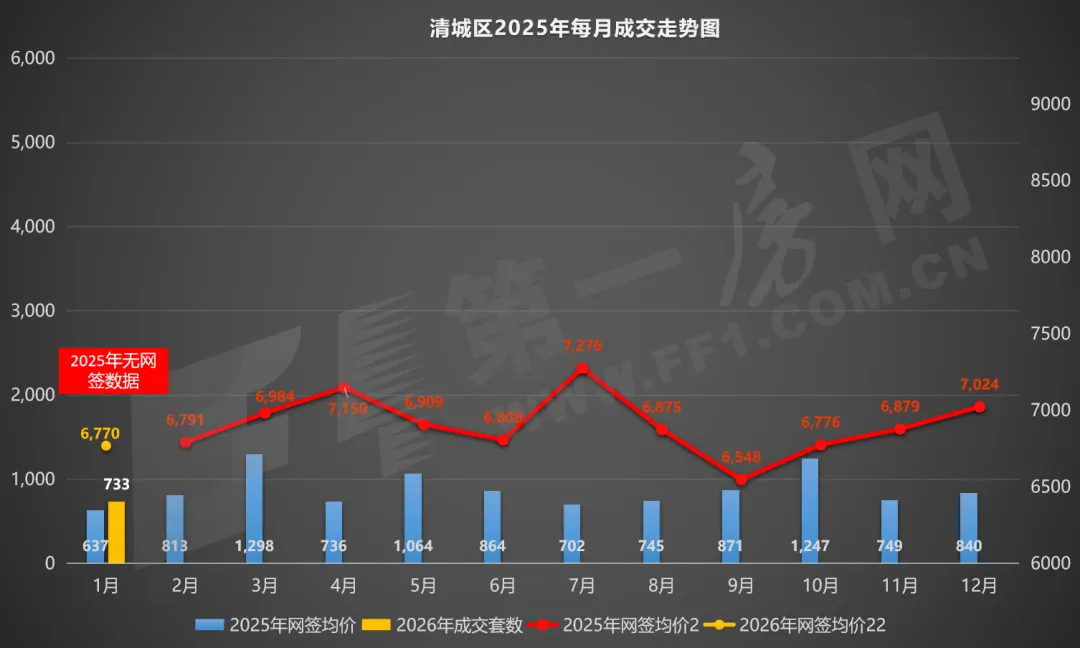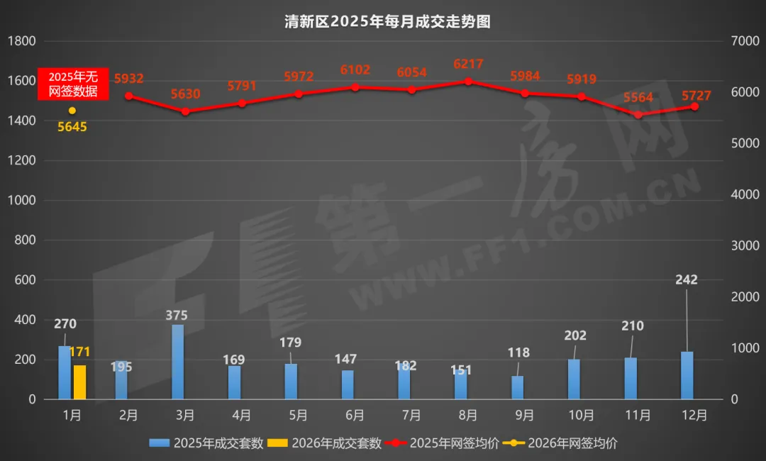 经历年末冲刺后,一月楼市成交热度出现季节性回落,清远市区新房成交回落,清城一手住宅网签环比上月跌13%,但同比2025年1月小幅上涨15%,网签均价环比跌4%;清新一手住宅环比跌29%,网签均价跌1%。